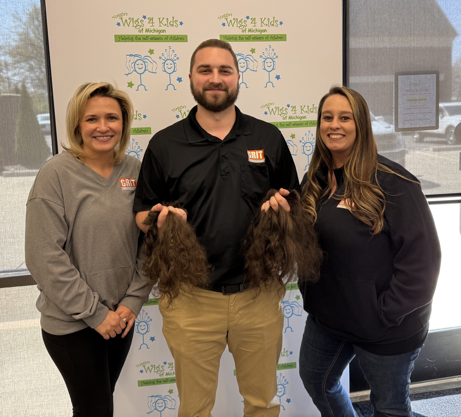 Brad from GRIT Technologies, a Gold Sponsor of Maggie's Wigs 4 Kids of Michigan and our managed IT company had his hair cut for donation today. He visited Go Green Salon a separate business inside our Wellness Center with his colleagues Kristen & Dana. During the tour, Dana shared that her daughter had been touched by cancer as an infant and is now doing very well! The GRIT team truly understands the work we do and we thank Brad for going the extra mile and contributing his hair to help us make a wig for a Michigan child in need.