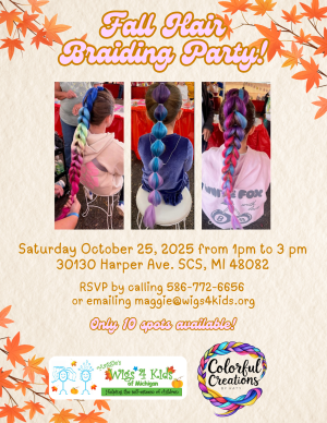 Wig recipients & families: Show your true colors! We'll be hosting a Fall Hair Braiding Party with Colorful Creations by Katy on Saturday, October 25th, 2025 at the Wellness Center. Katy is a stylist who weaves colorful hair extensions into out-of-this-world braids! Choose from a traditional braid, bubble braids, or dragon braids like Rumi from the hit Netflix movie Kpop Demon Hunters. The party starts at 1pm, and all wig recipients & siblings are welcome. Space is limited to 10 guests, so RSVP today! Call 586-772-6656 or email maggie@wigs4kids.org to reserve your place.