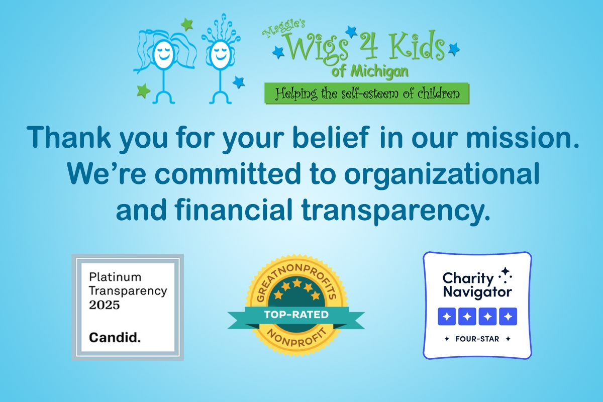 At Maggie's Wigs 4 Kids of Michigan, we're truly grateful to be recognized by GuideStar, Charity Navigator, and GreatNonprofits. These acknowledgments aren't about awards—they're about accountability, trust, and our ongoing commitment to financial & organizational transparency in serving the children & families of Michigan at no charge. We strive to be good stewards of the time, talent & treasure bestowed on our organization by you - our amazing supporters! Thank you for working together with us to help the kids!