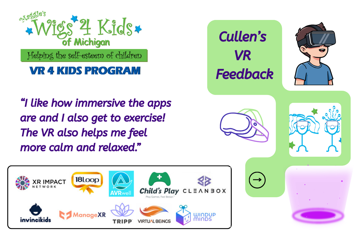 Cullen is 11 years old and experiencing alopecia; an autoimmune disorder causing hair loss. In addition to receiving a wig, Cullen signed up to participate in our VR 4 Kids Program, powered by XR Impact Network to help him achieve moments of calm & relaxation while navigating his health challenge. Dad writes, "thank you so much for all you have done for Cullen and our family. He would absolutely be using this for hours & hours if I allowed that much time, lol" -- you can see his feedback in this post!