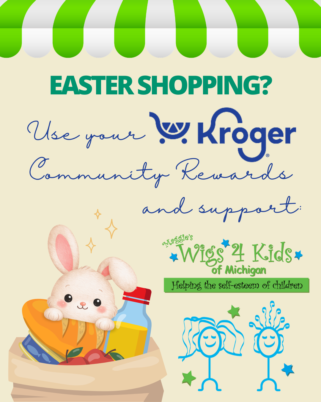 Whether you're shopping for decor, groceries or basket fillers for your Easter celebration, Kroger has you covered! Make sure your Kroger card is registered using code HH709 at www.krogercommunityrewards.com and a portion of your shopping proceeds will benefit Maggie's Wigs 4 Kids of Michigan!