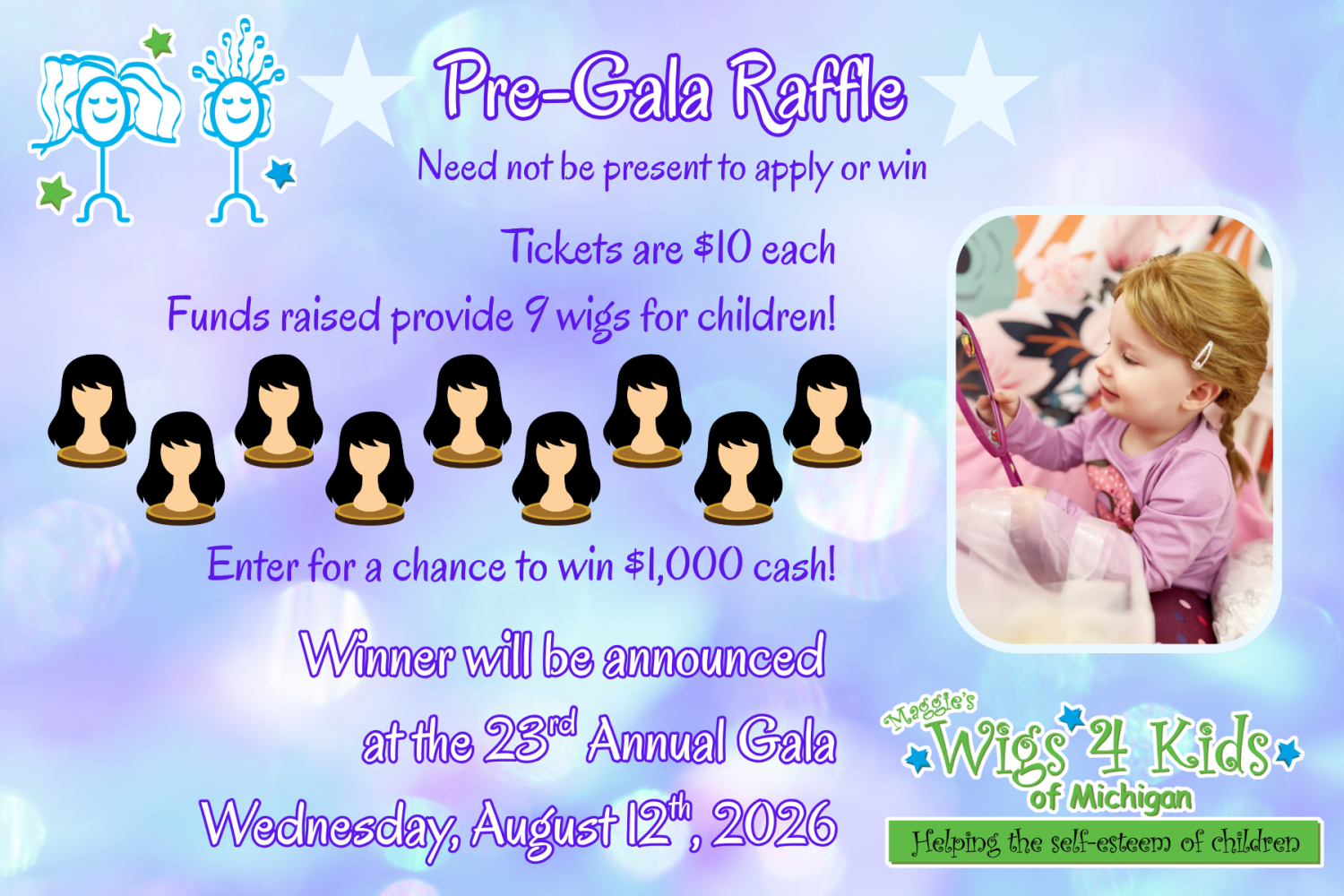 Every year we host a pre-gala raffle where the purchase of a $10 ticket helps Maggie's Wigs 4 Kids of Michigan provide wigs to 9 children in need. Your $10 also enters you for a chance to win the $1,000 CASH prize which you need not be present to win! ???? To purchase your pre-gala raffle tickets and help the kids, visit: http://mw4k23.givesmart.com