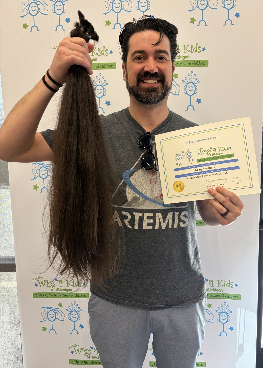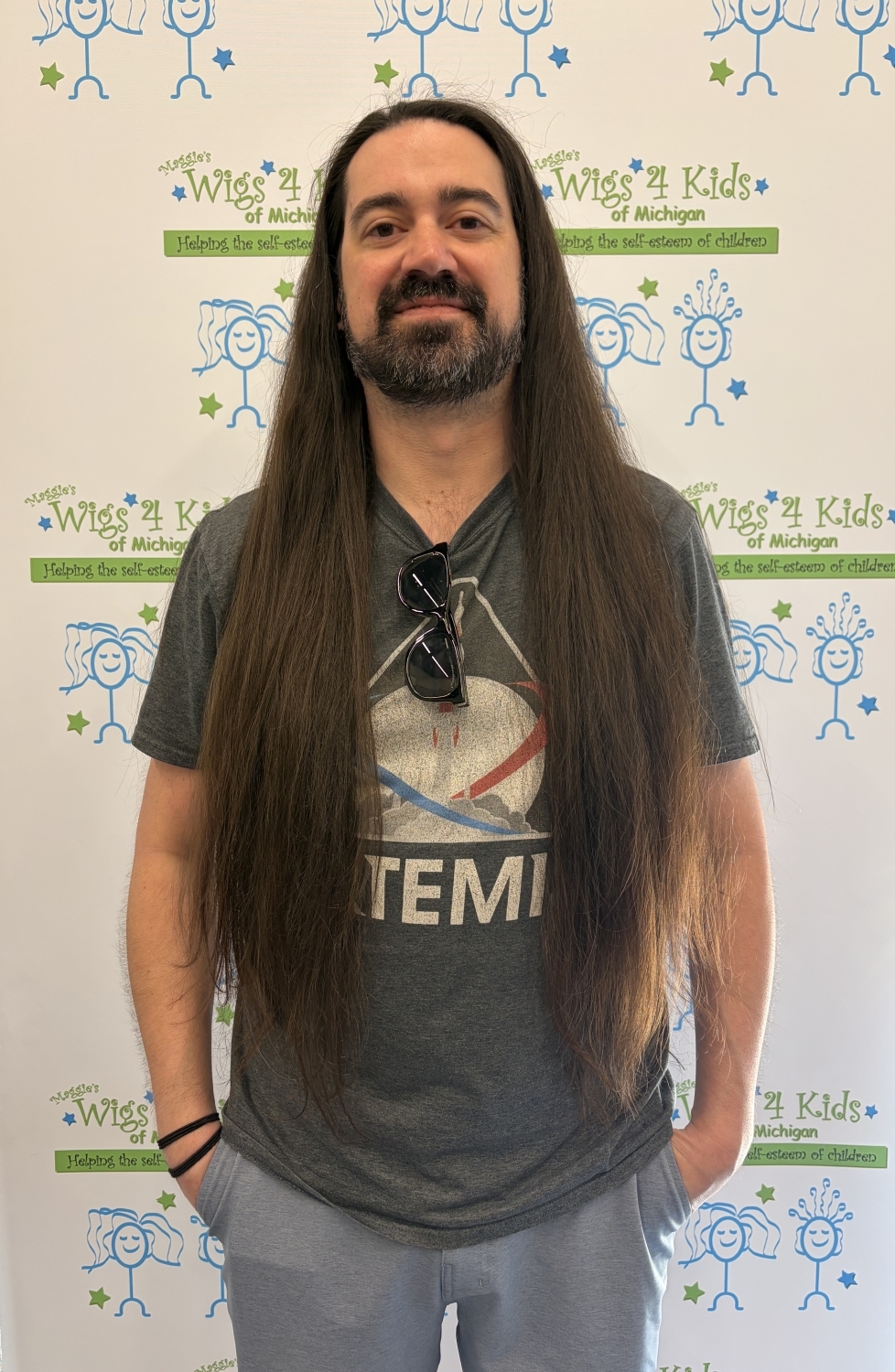 Another incredible hair donation to Maggie's Wigs 4 Kids of Michigan! Greg has been growing his hair out for years and wanted to help a child in need of a wig. He contributed over 2 ft of hair by having it cut at Go Green Salon, a separate business located inside our Wellness Center. Thank you, Greg for your love & support of the kids!