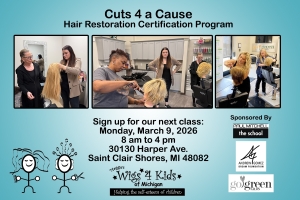 Calling all cosmetologists: our hair restoration training & certification class is filling quickly! This one-day workshop teaches all facets of hair restoration and certifies licensed stylists to provide wigs & services to children and adults. Through a grant from Paul Mitchell The School Michigan and the Andrew Gomez Dream Foundation, this comprehensive training is available at no charge. To register, please visit: https://www.wigs4kids.org/donate-hair/cuts-4-a-cause.html