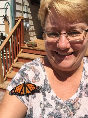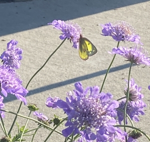 Our master gardener Lori Smith is the queen of butterflies and not only tends to our Angel Memorial Garden to keep it beautiful, she also educates us about the various butterfly species that grace this reflective space at our Maggie's Wigs 4 Kids of Michigan Wellness Center. We recently had a delightful yellow butterfly visiting our pincushion flowers! Lori also planted fall arrangements in pots near the entrance and we thank her for her time & talented donated.