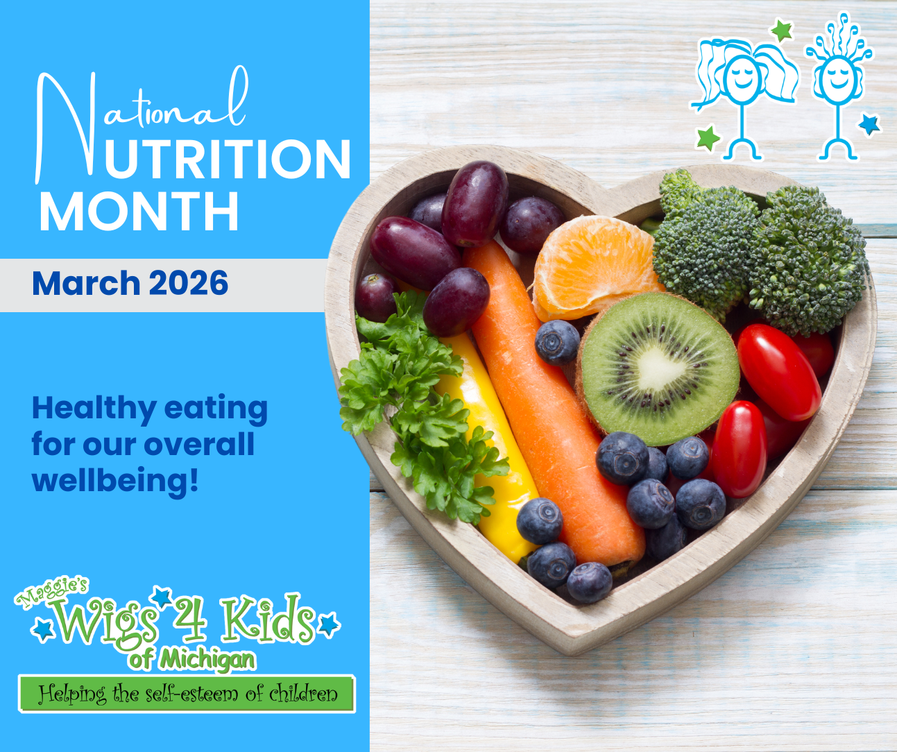 March is National Nutrition Month and we know that good nutrition plays an important role in overall wellbeing—especially for the wig recipients we serve who are bravely facing cancer and other medical disorders. Nourishing the body with wholesome foods helps support energy, healing, and strength! We have a pediatric oncology dietician available for consultations to help with making informed choices. If any of our current families are in need of this service, please call 586-772-6656.