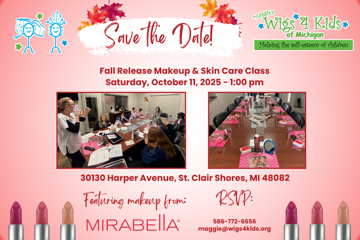 Dear wig recipients & families: we are excited to announce our next makeup & skin care class for Maggie's Wigs 4 Kids of Michigan, focused on the new fall release of products from Mirabella Beauty is being held on Saturday, October 11, 2025...