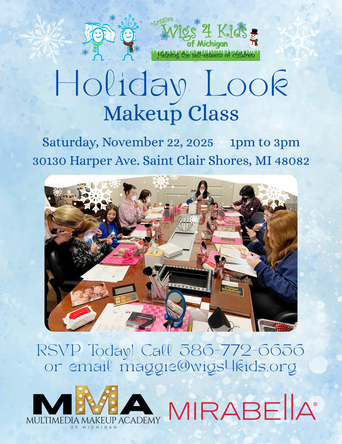 Dear wig recipients & families: mark your calendar! Our "Holiday Look" makeup & skin care class is being held on Saturday, November 22, 2025 from 1-3 pm at our Maggie's Wigs 4 Kids of Michigan Wellness Center in St. Clair...