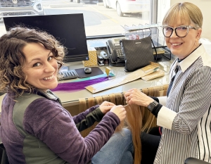 Renee, a licensed cosmetologist from Bocci Salon & Spa came in to volunteer today. She is a Cuts 4 a Cause graduate, thanks to our grant from Paul Mitchell The School Michigan and the Andrew Gomez Dream Foundation! Renee helped with several hair restoration projects, including a new peek-a-boo pastel weft for a hair hat in the making - we thank her for donating time & talent to help the kids!