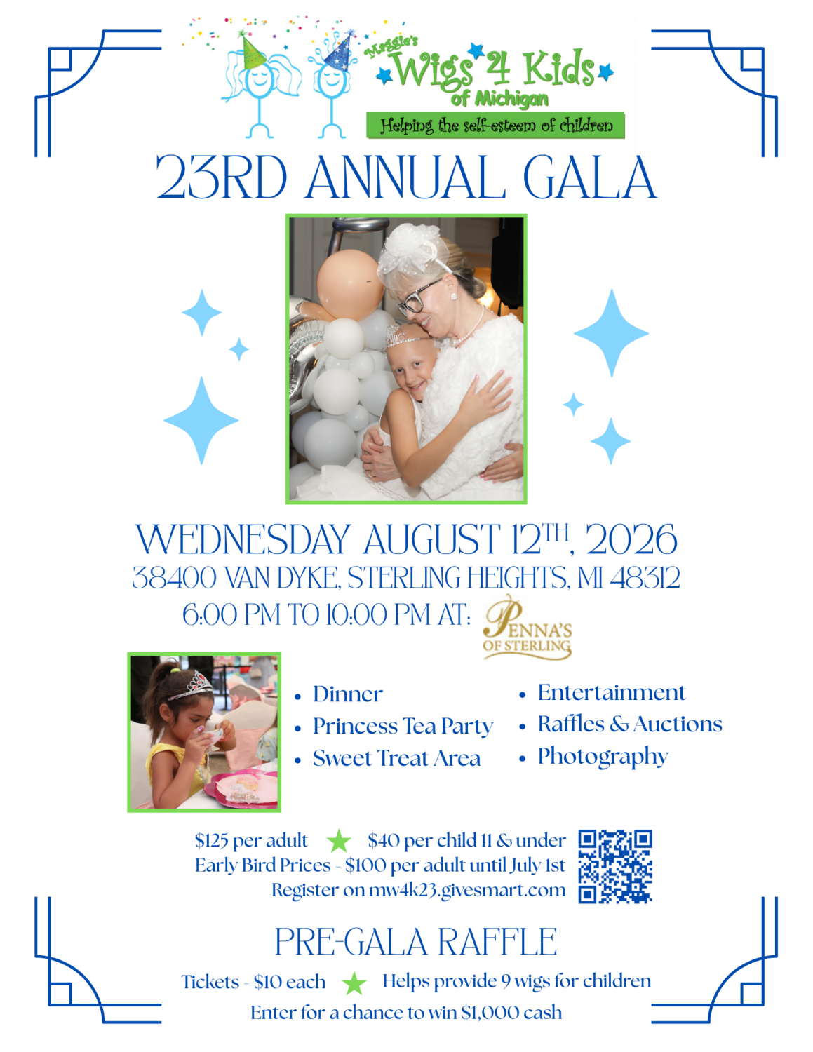 Save the date! Our signature event of the year: Maggie's Wigs 4 Kids of Michigan's 23rd Annual Gala is being held on Wednesday, August 12, 2026 - 6:00 pm at Penna's of Sterling. This is our largest celebration of the strength & courage of our wig recipients & families and key fundraiser of the year - don't miss it! Early bird pricing runs until July 1st - tickets available at: http://mw4k23.givesmart.com