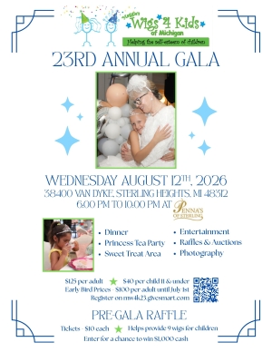 Save the date! Our 23rd Annual Gala for Maggie's Wigs 4 Kids of Michigan will be held on Wednesday, August 12, 2026 - 6:00 pm at Penna's of Sterling. This is a wonderful opportunity to celebrate the strength & courage of our wig recipients and families. The gala is also our only major fundraiser that we host during the year to help continue our mission. Bring family, friends and colleagues to enjoy a beautiful evening with dinner, prizes, entertainment and more: http://mw4k23.givesmart.com