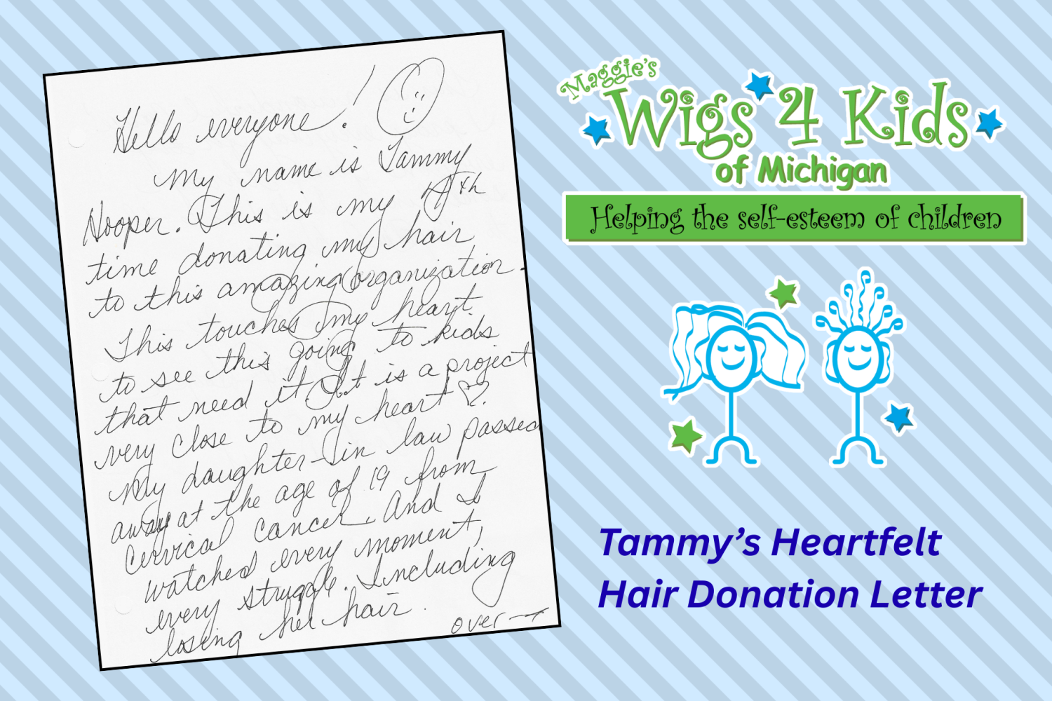 We received a beautiful letter with a hair donation from Tammy that reads "This is my 4th time donating my hair to this amazing organization. This touches my heart to see this going to kids that need it. It is a project very close to my heart. My daughter-in-law passed away at the age of 19 from cervical cancer and I watched every moment, including losing her hair. This is a wonderful cause, and I pray every day for everyone going through something. I dedicate my hair donation to Crystal!"