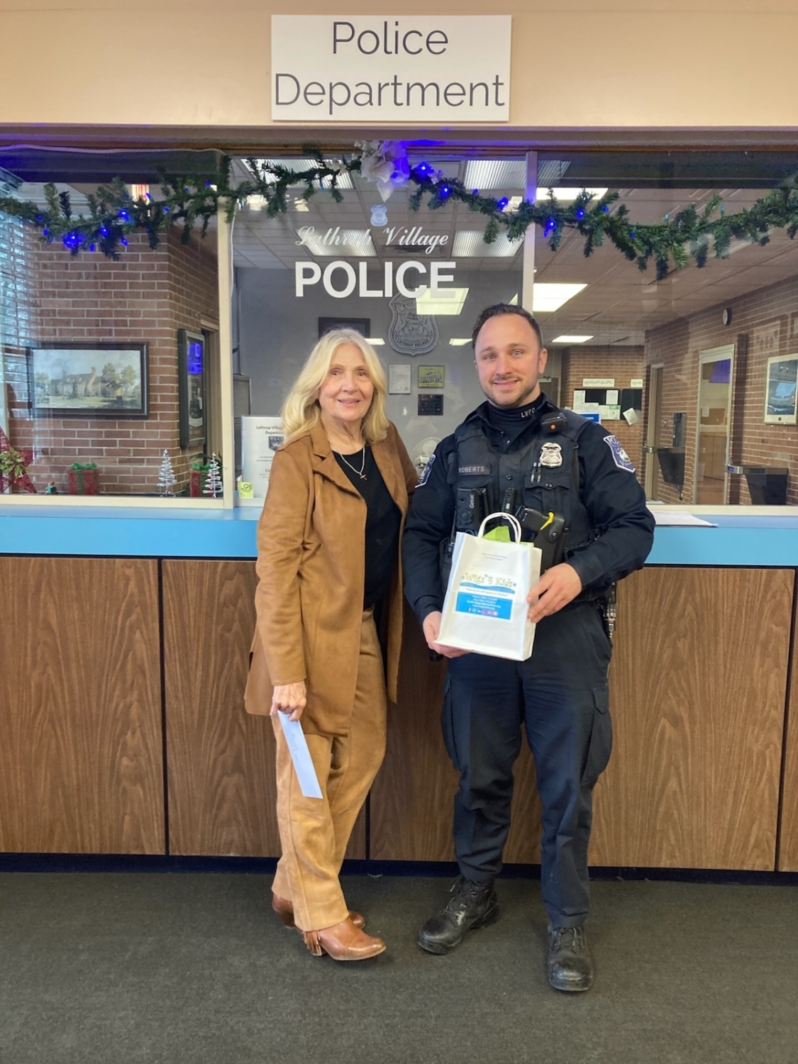 Mary is one of our Advisory Board members at Maggie's Wigs 4 Kids of Michigan and she volunteers her time to support our community outreach efforts. Today she visited the Lathrup Village Police Department to thank police command & staff for participating in the annual Pigs 4 Wigs campaign and receive their final donations for the year. Thank You, Mary and Lathrup Village PD!