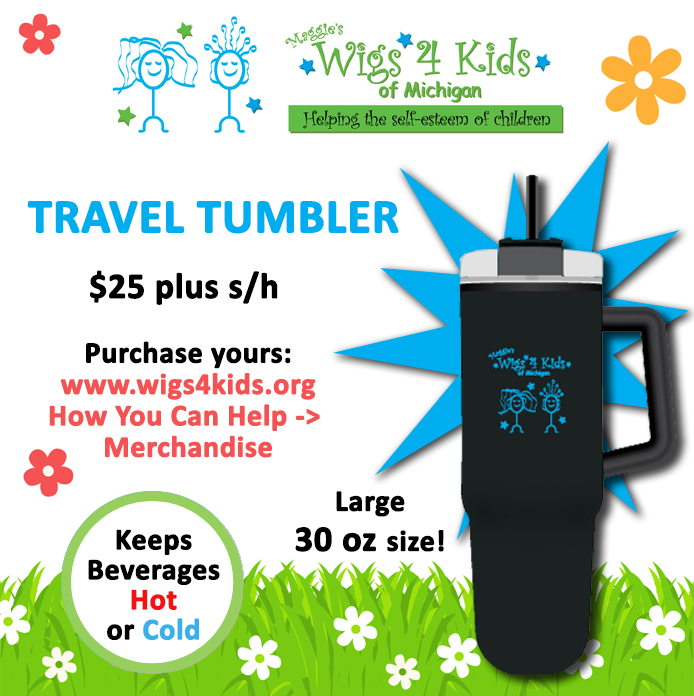 If you're enjoying the outdoors this spring, our travel tumbler is the perfect companion to walks, runs and sports! Featuring our Maggie's Wigs 4 Kids of Michigan logo, it shows your support of the kids while keeping drinks cold or hot. Make a donation of $25 + shipping/handling to receive yours delivered right to your door: https://www.wigs4kids.org/how-you-can-help/wigs-4-kids-merchandise.html