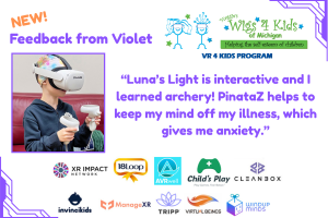 As our wig recipient Violet bravely fights cancer, she has the resources of our VR 4 Kids Program available to utilize whenever she feels sad or anxious. Her Invincikids headset makes it possible for Violet to forget about her health challenge for a little while as she engages in various apps. We thank XR Impact Network and our VR partners for ensuring that kids like Violet can achieve peaceful moments in the midst of medical treatment.