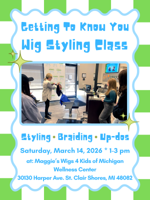 Dear wig recipients & families: our next class is right around the corner! Join us on Saturday, March 14, 2026 from 1-3 pm at our Maggie's Wigs 4 Kids of Michigan Wellness Center for a wig styling & braiding session! This is great for beginners or those who are accustomed to achieving different looks with your wig, as you can always learn something new. To RSVP, please call 586-772-6656.
