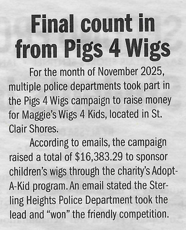 C&G News has shared the final fundraising total from our November 2025 Pigs 4 Wigs Campaign in the Saint Clair Shores Sentinel. We want to thank them for their support this past year. Read their coverage below!