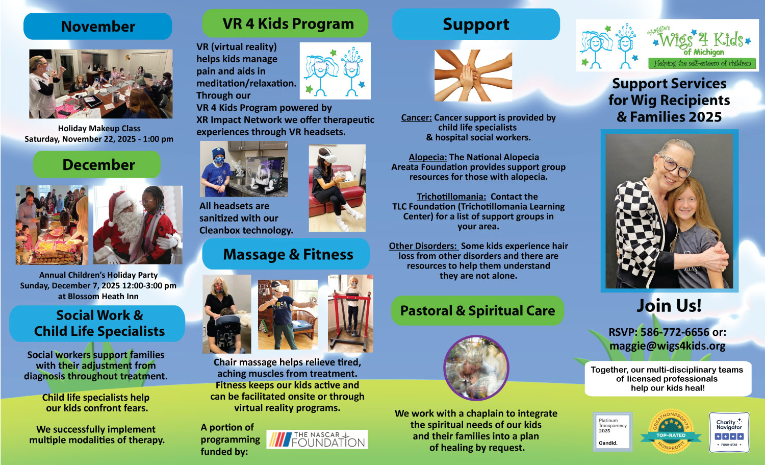 Please click on the image below to open up a larger version of our support services brochure. This details the comprehensive programming we offer in addition to the custom-made wigs we provide to the children & families of Michigan.